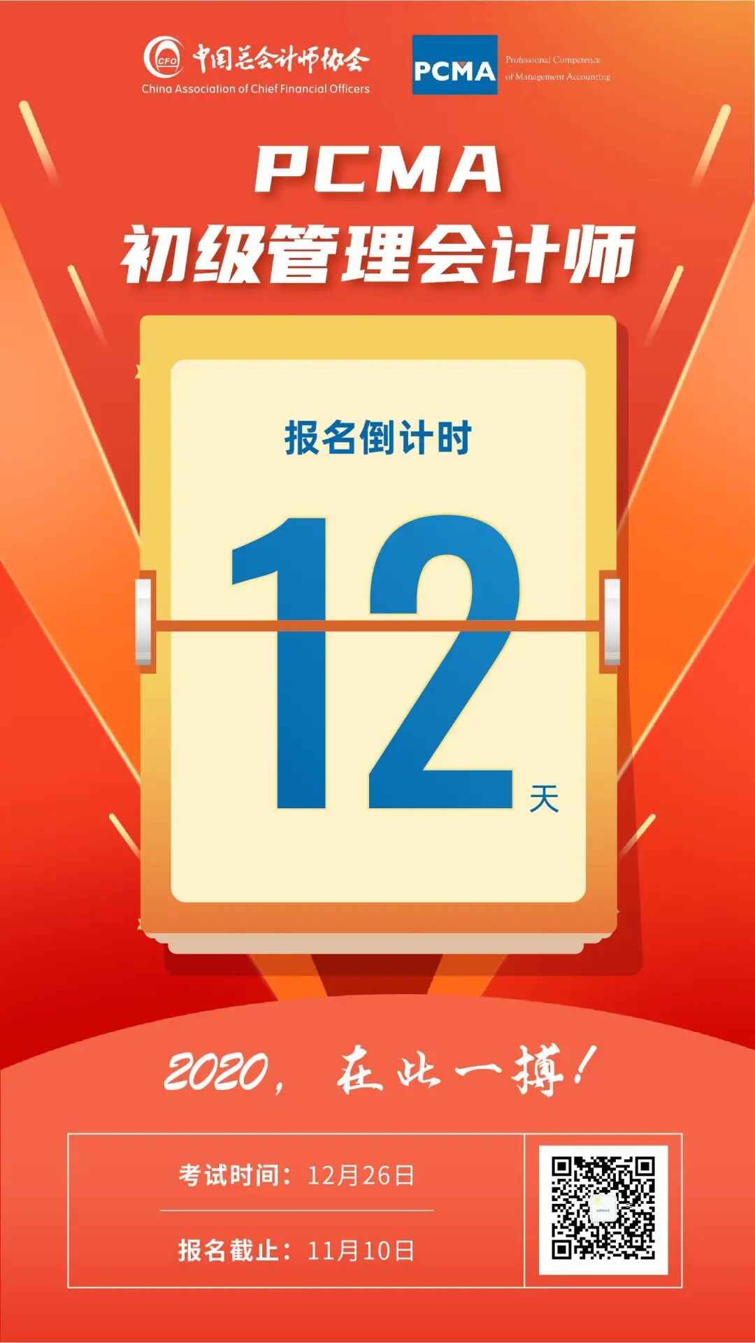 2020年最后一次管理会计师初级的考试时间是12月26,报考时间是9.1-11.10号。
